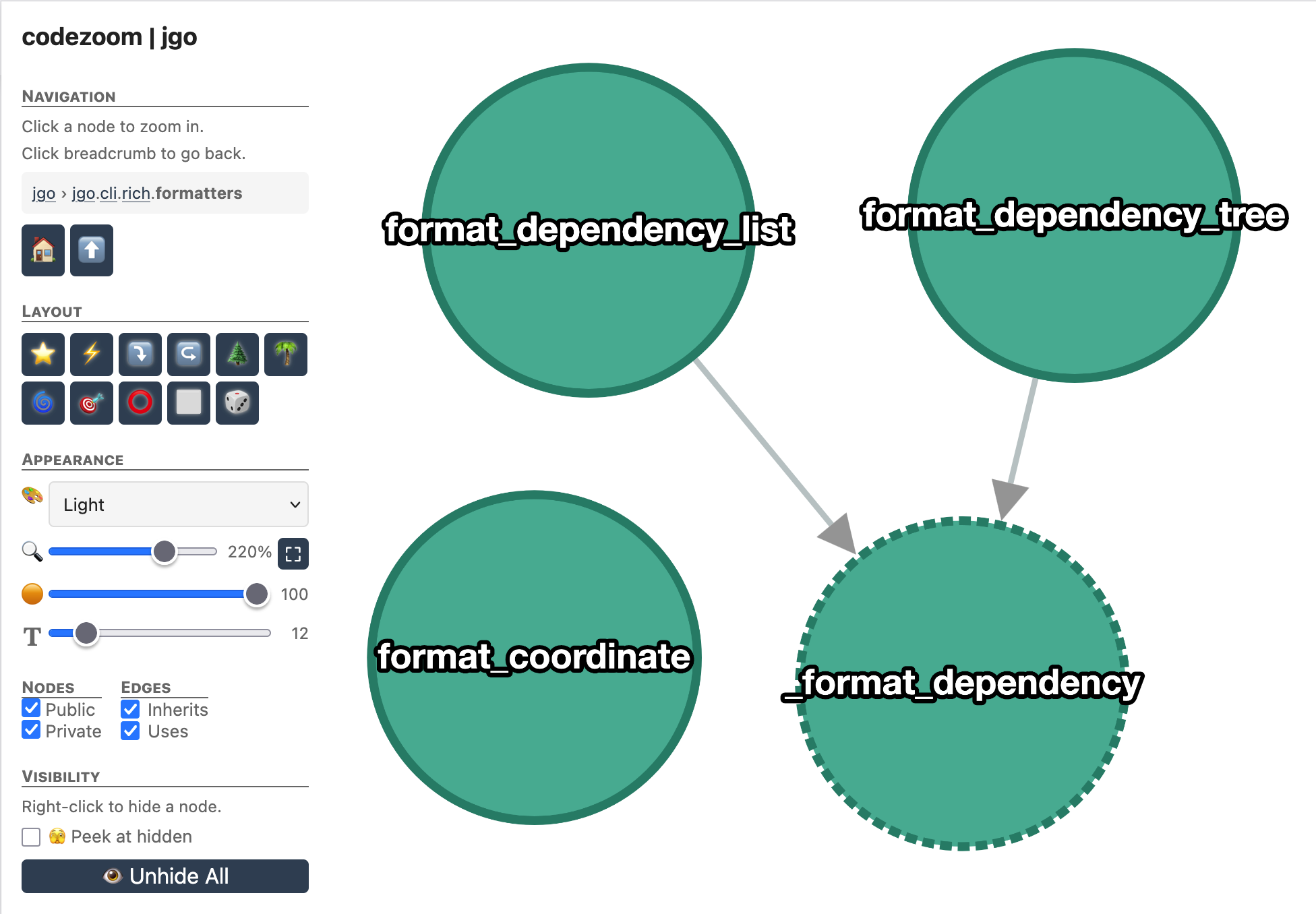 Codezoom generates a standalone HTML file that lets you explore a project's structure at multiple levels of detail. Click any node to drill down; use breadcrumb navigation to go back up.