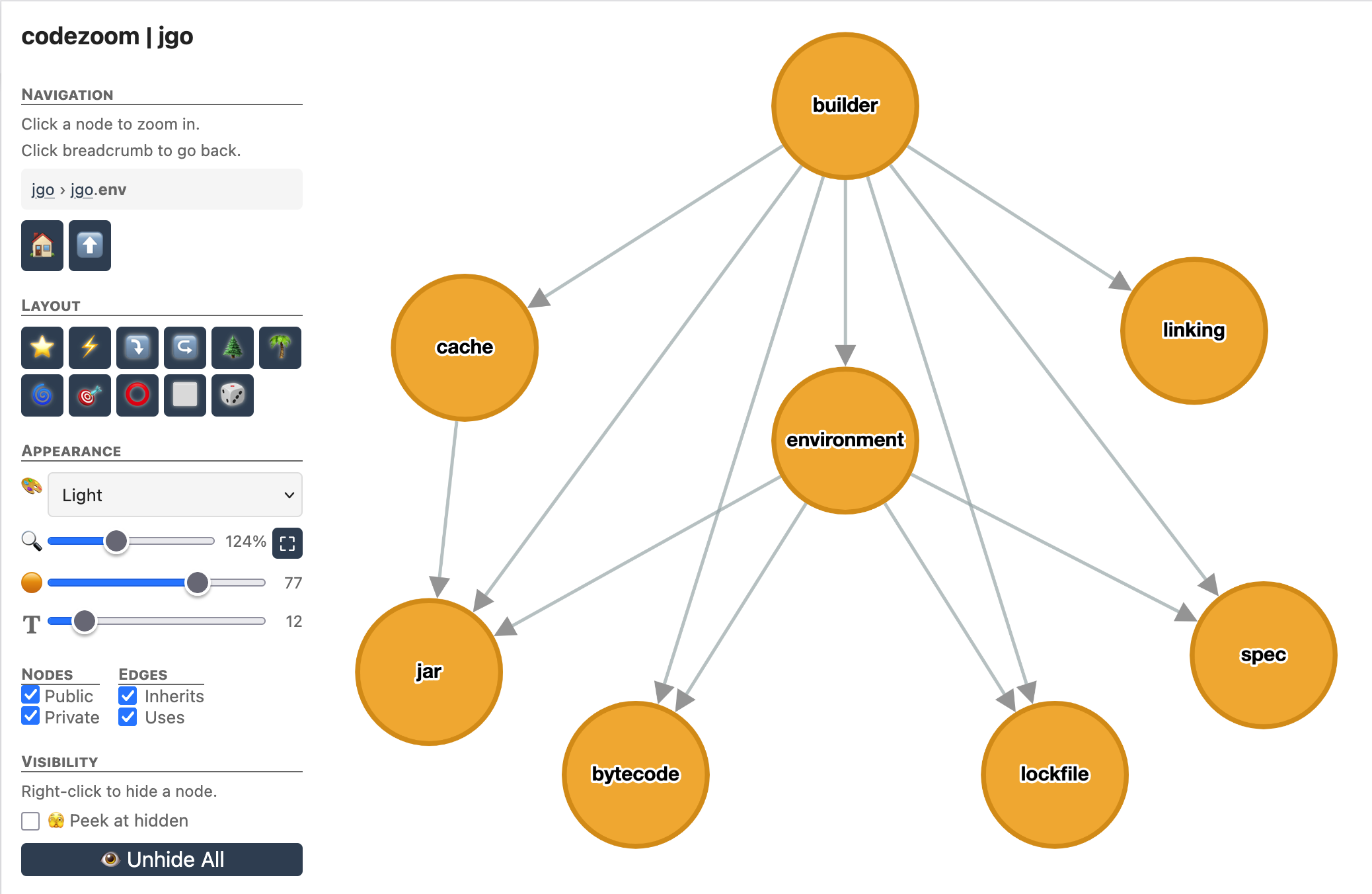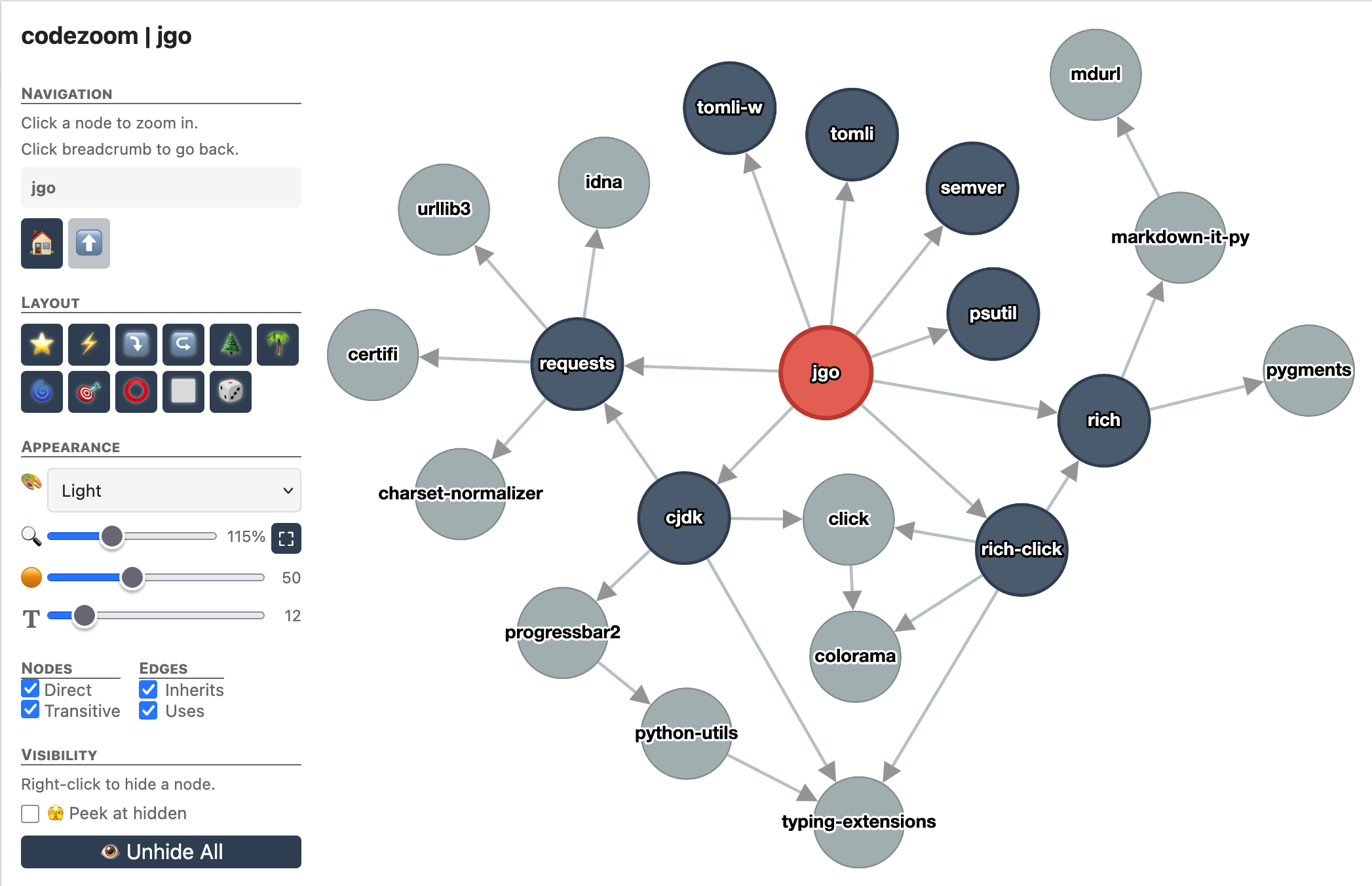 jgo(direct + transitive with scope filtering) - Hierarchy: Package tree via